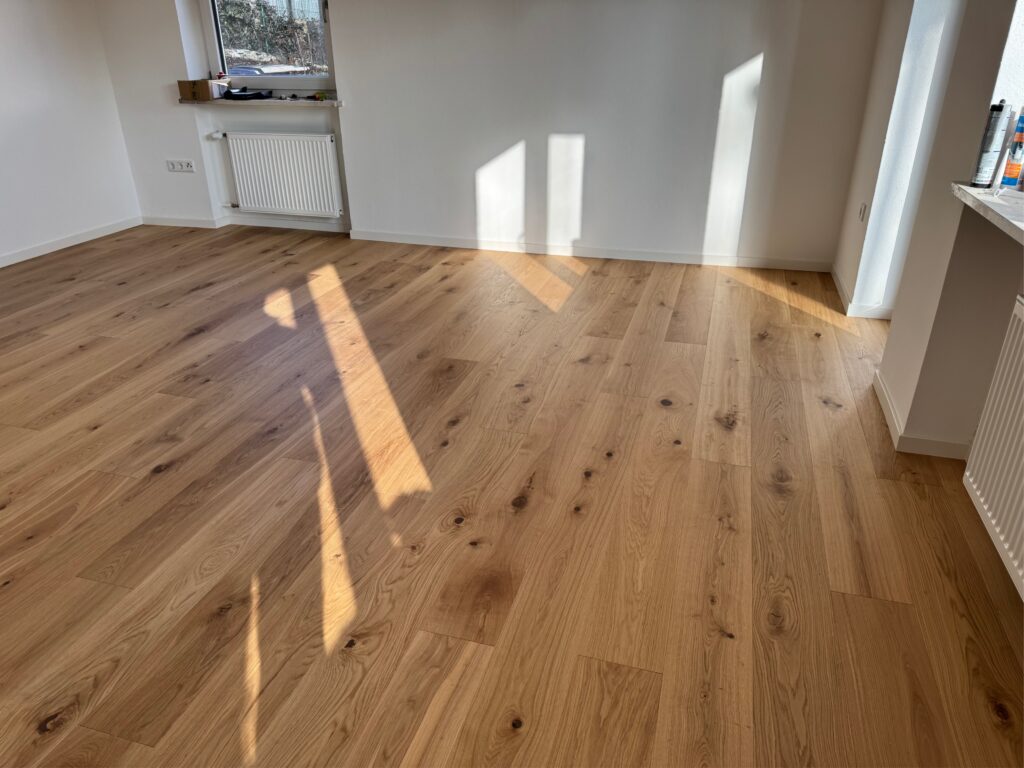 – Wohnzimmer mit Holzboden, Zugang zum Balkon im EG